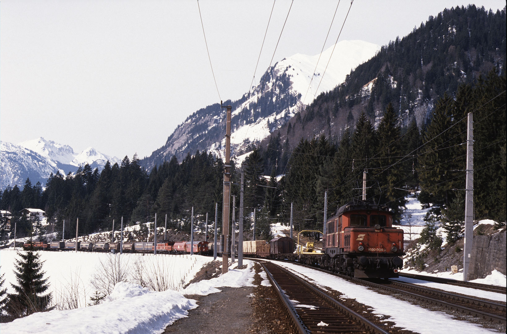 ÖBB 1020 034 (08.03.1990, Wald/Arlberg, m. Schublok und 1020 mit Brandschutzzug)