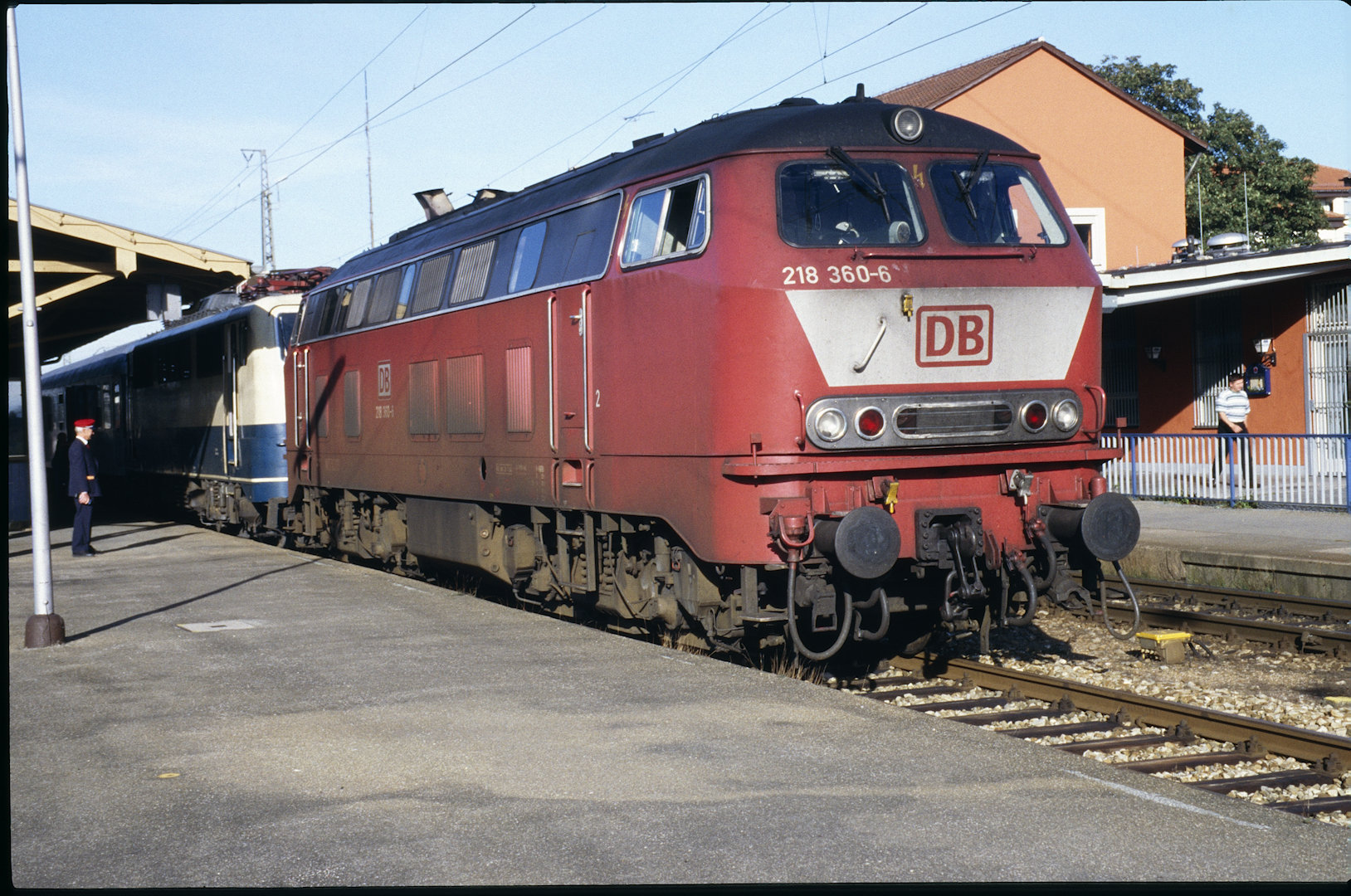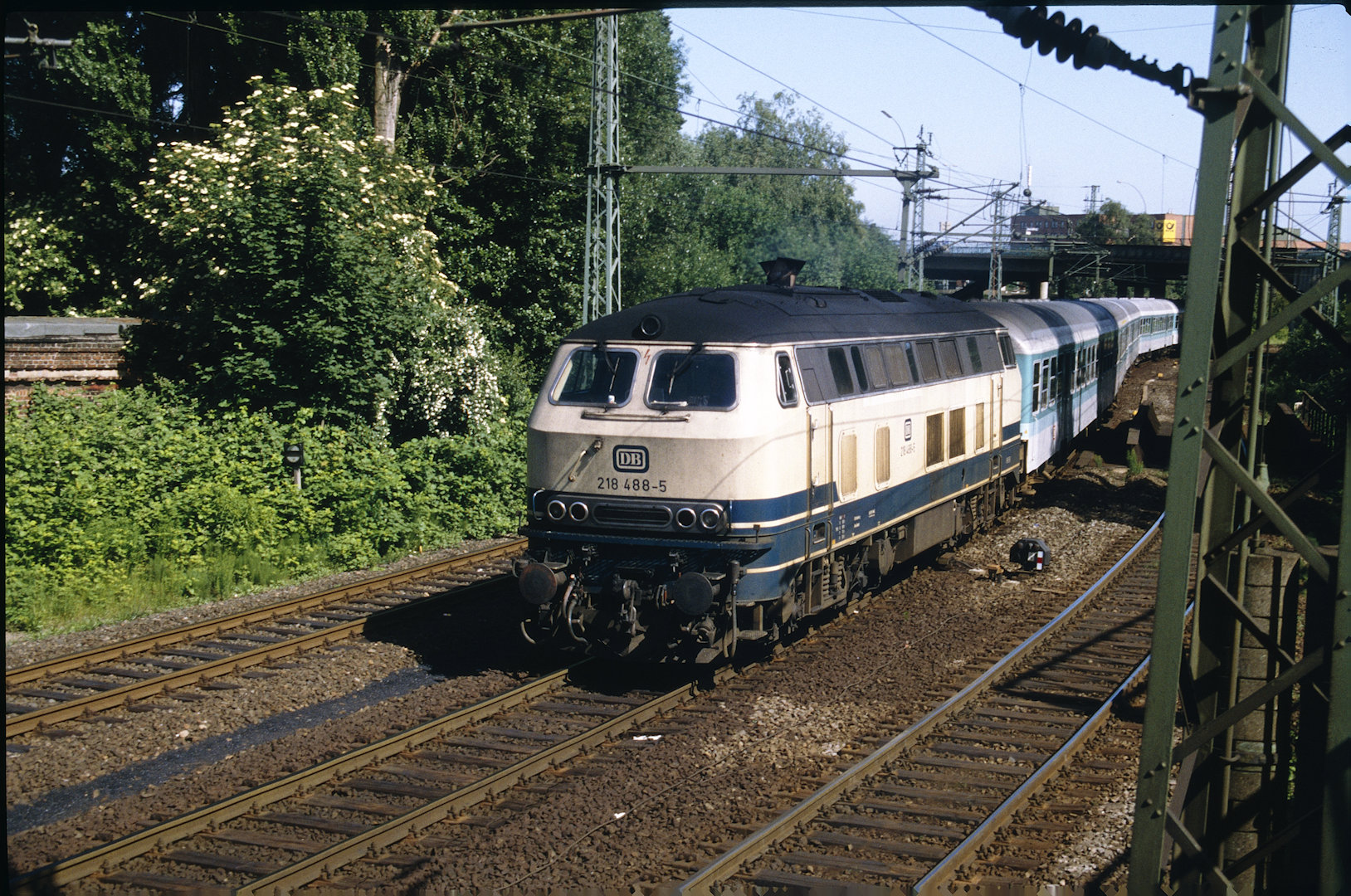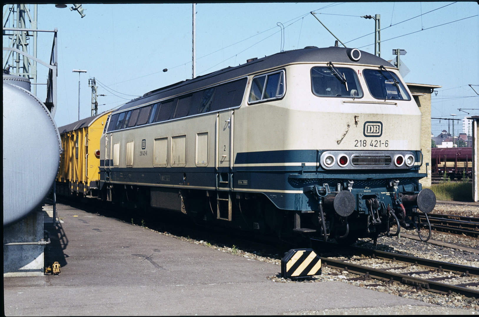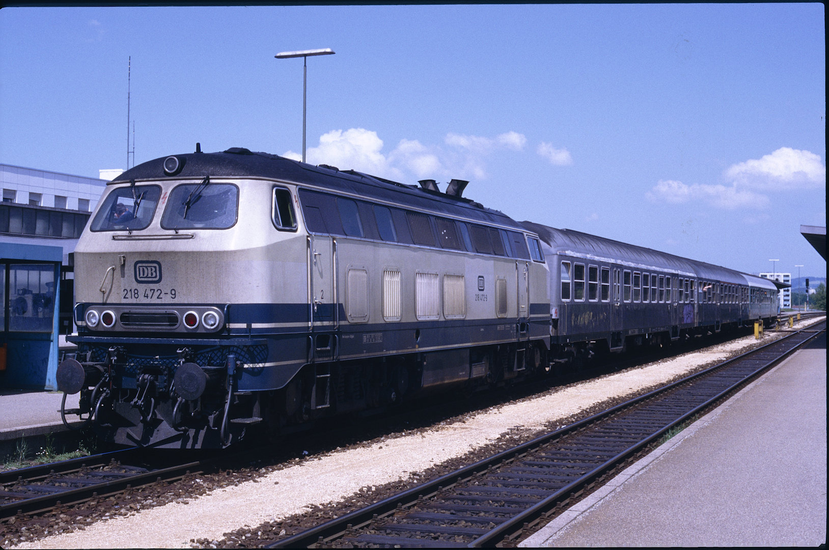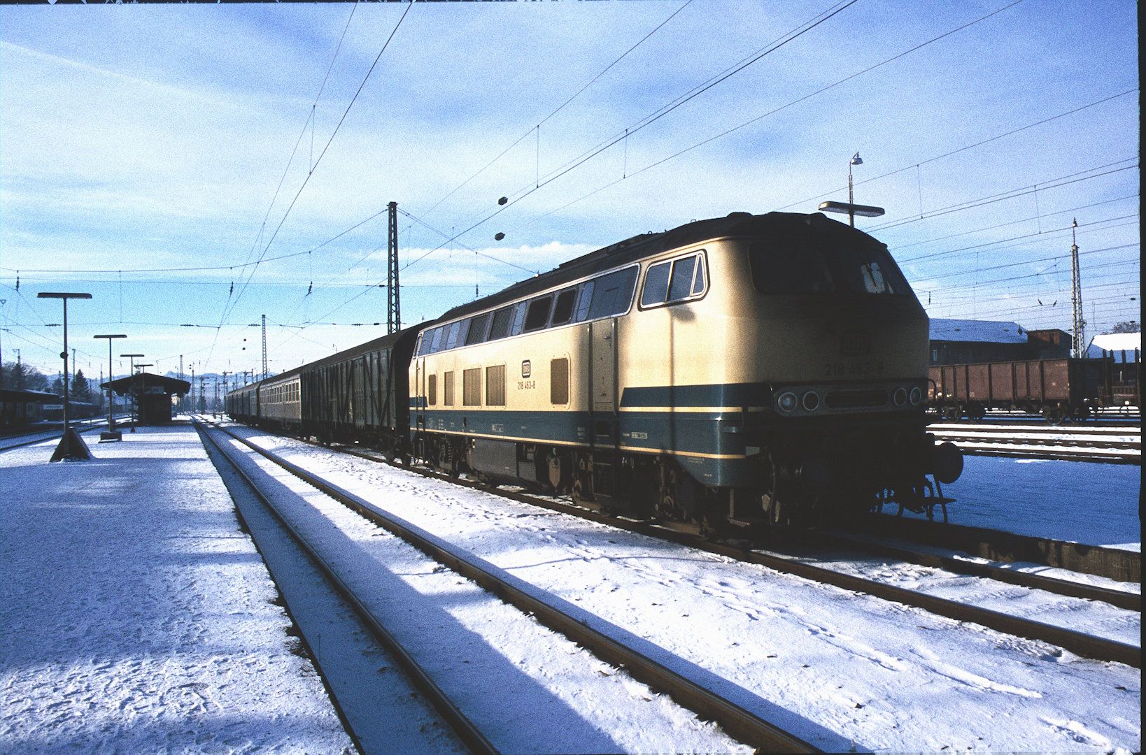 DB 218 447 (1980, München-Donnersbergerbrücke, (mit 210 xxx), info:Lok ist unscharf) |